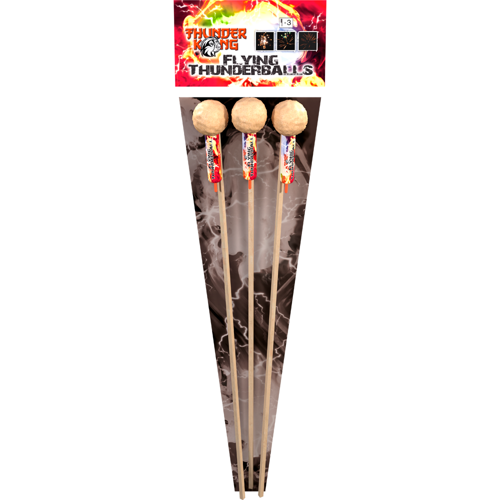 | Effektbeschreibung | Flying Thunderballs sind drei spektakuläre Raketen, jede mit einem dicken Burst! Von der leuchtenden Crown über die goldene Coco bis hin zu den Crackling Strobes. Maximale Effekte! |