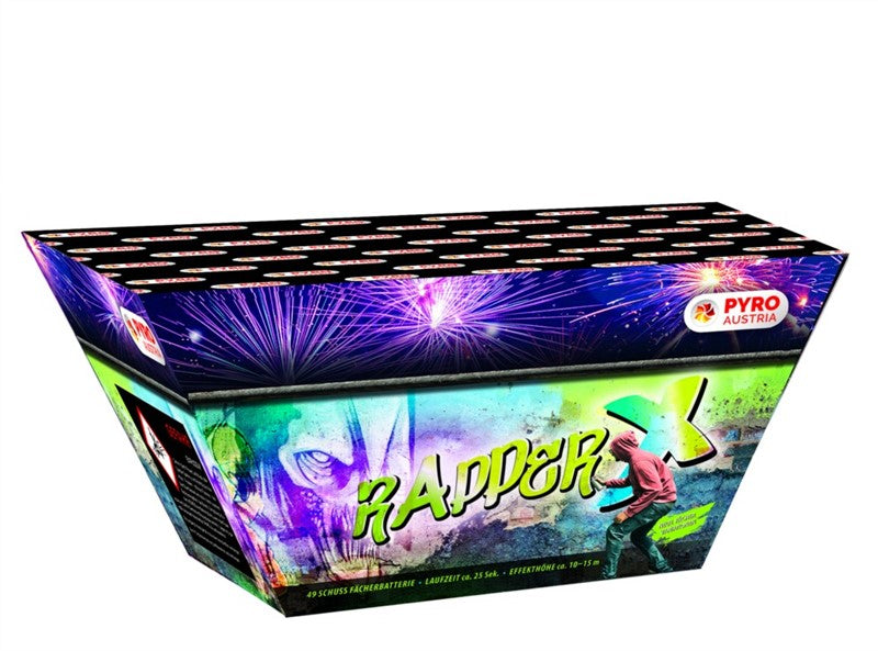 Rasante 49 Schuss Fächerbatterie mit Brocade Effekten. Die Kombination mit roten und weißen Crackling Sternen ergibt einen besonders eindrucksvollen Effekt.